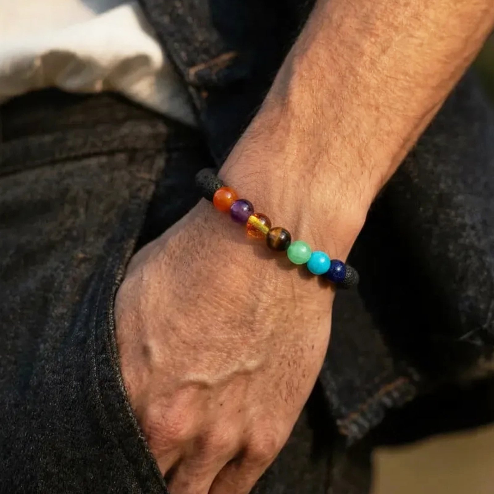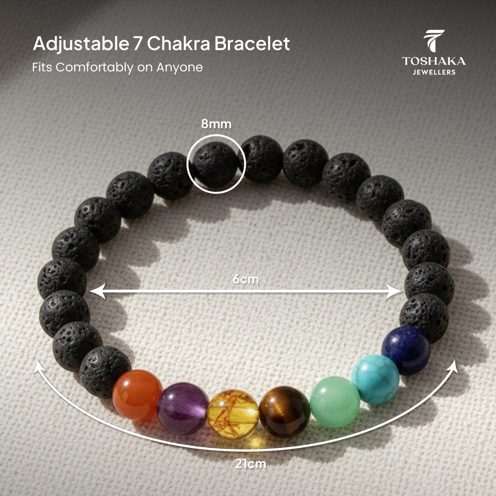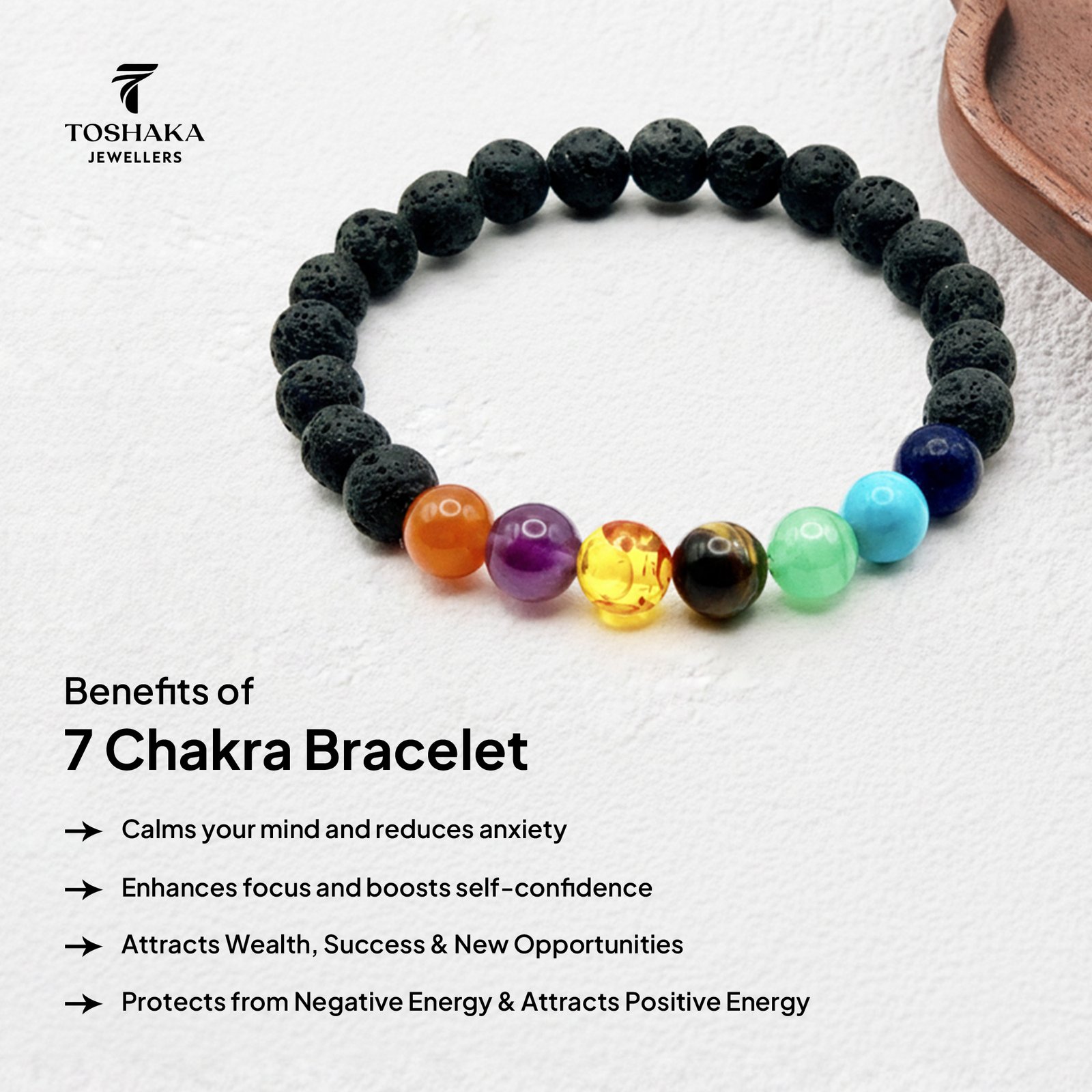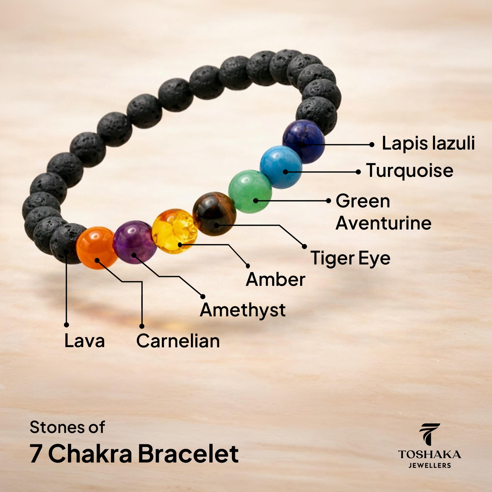 Toshaka Jewellers 7 Chakra Bracelet features natural gemstones: Lapis Lazuli, Turquoise, Green Aventurine, Tiger Eye, Amber, Amethyst, Carnelian with black Lava Stone beads. Elastic cord fits all wrists for men and women. Promotes balance, peace, reduces stress, boosts confidence, attracts wealth. Perfect for yoga, meditation, aromatherapy and daily wellness.
