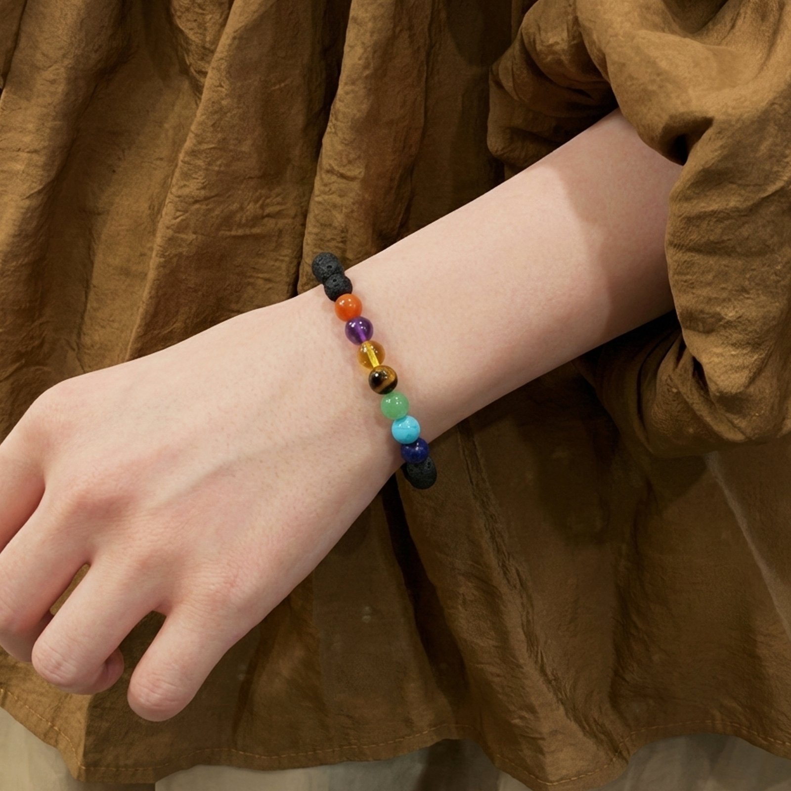 Introducing the Toshaka Jewellers 7 Chakra Bracelet – your perfect companion for daily peace, balance, and positive energy. This beautiful healing crystal bracelet features natural gemstone beads that work together to align your seven chakras and promote overall wellness. Each bracelet contains black Lava Stone beads combined with seven powerful chakra stones: Lapis Lazuli, Turquoise, Green Aventurine, Tiger Eye, Amber, Amethyst, and Carnelian. These genuine crystals help calm your mind, reduce anxiety and stress, enhance focus, boost self-confidence, and attract wealth and success into your life. The lava stone beads are naturally porous, making this bracelet perfect for aromatherapy – just add a drop of your favorite essential oil and enjoy calming scents all day long. With 8mm smooth beads and perfectly sized with a reinforced, durable elastic cord (21cm circumference / 6cm inner diameter), this meditation bracelet comfortably fits any wrist size for both men and women. Whether you’re practicing yoga, meditating, or simply going about your day, this 7 Chakra Bracelet serves as a beautiful reminder to stay grounded and positive. The natural black lava beads paired with colorful gemstones create a stylish look that goes with any outfit while providing energy healing and spiritual protection. Perfect as a meaningful gift for anyone interested in holistic wellness, mindfulness, reiki healing, or crystal therapy. Wear your Toshaka Jewellers 7 Chakra Bracelet daily and experience the difference that balanced energy can make in your life.