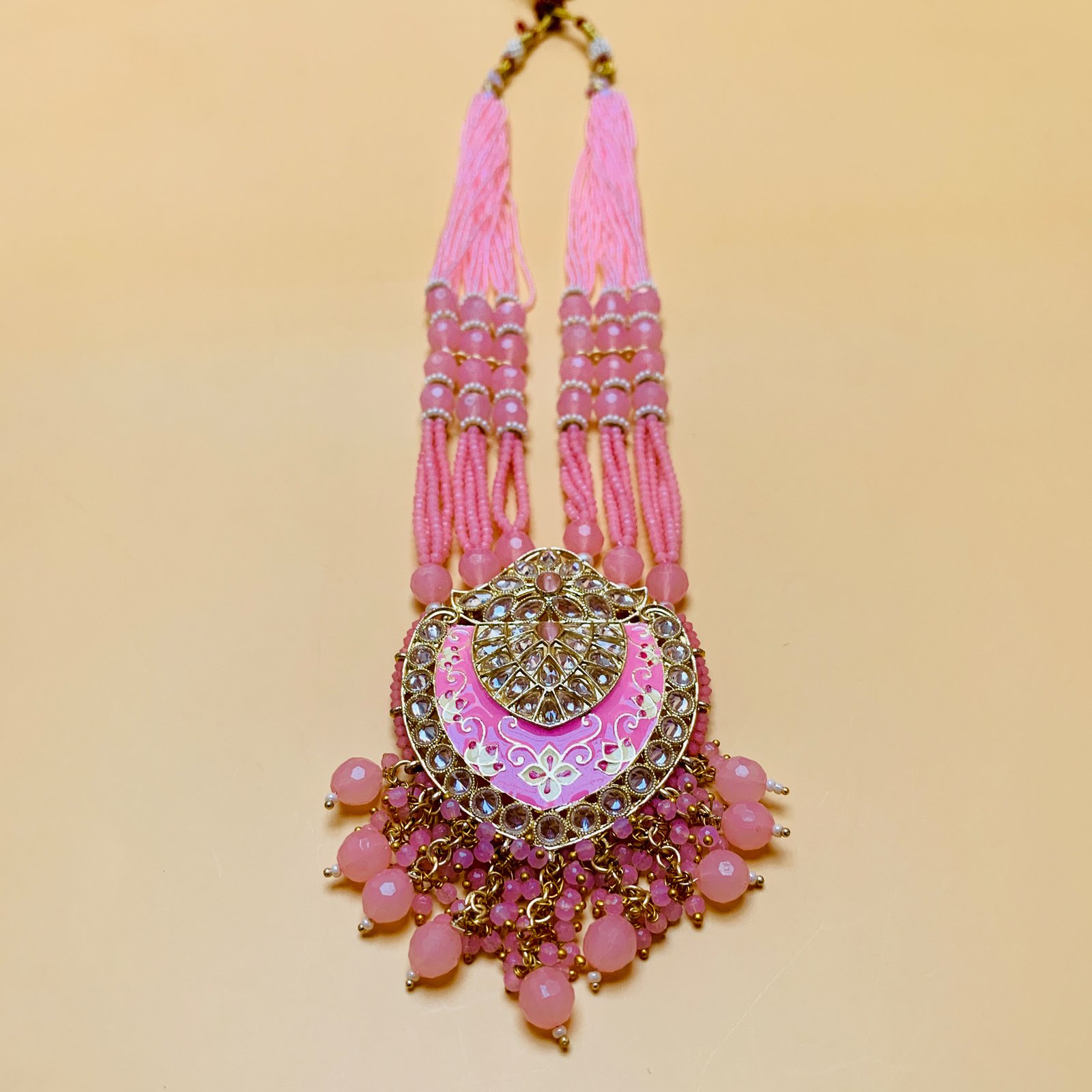 This Kundan imitation long necklace set from Toshaka Jewellers blends traditional craftsmanship with graceful proportions. The necklace features multiple strands of pink artificial moti beads anchored by a large teardrop-shaped pendant adorned with white cubic zirconia stones, Kundan accents, and intricate gold detailing. A floral motif crowns the pendant, while dangling pink beads add movement and richness. Matching side motifs balance the layout and enhance the overall symmetry.