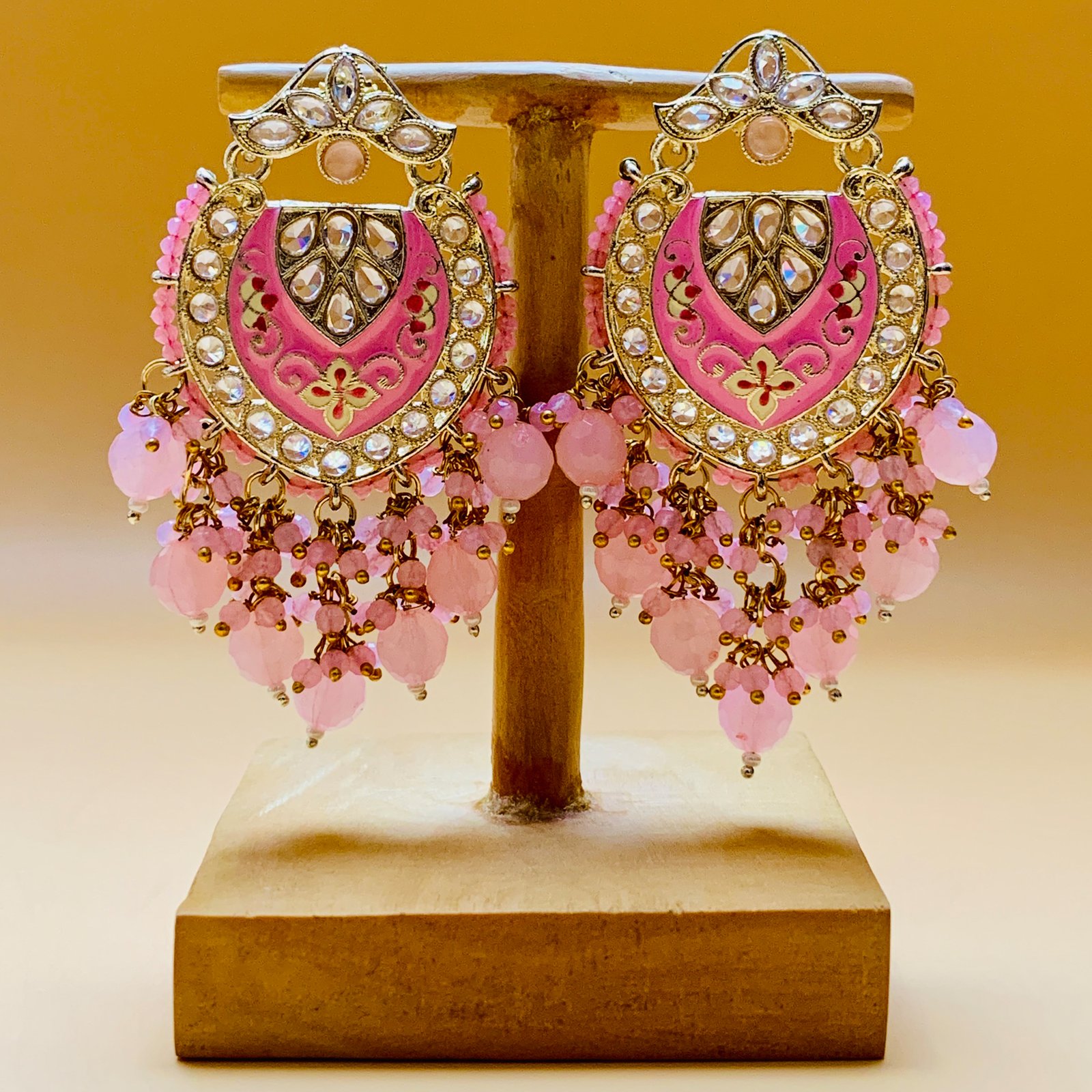 The coordinated earrings mirror the pendant design with generous drop length, white stones, and pink bead embellishments for a cohesive, statement-making finish. Crafted on a sturdy brass base with gold plating, the set offers substantial presence and refined sparkle without the care demands of fine jewellery. Ideal for bridal wear, festive functions, and styled shoots, this set delivers timeless elegance with cultural depth and polished impact.