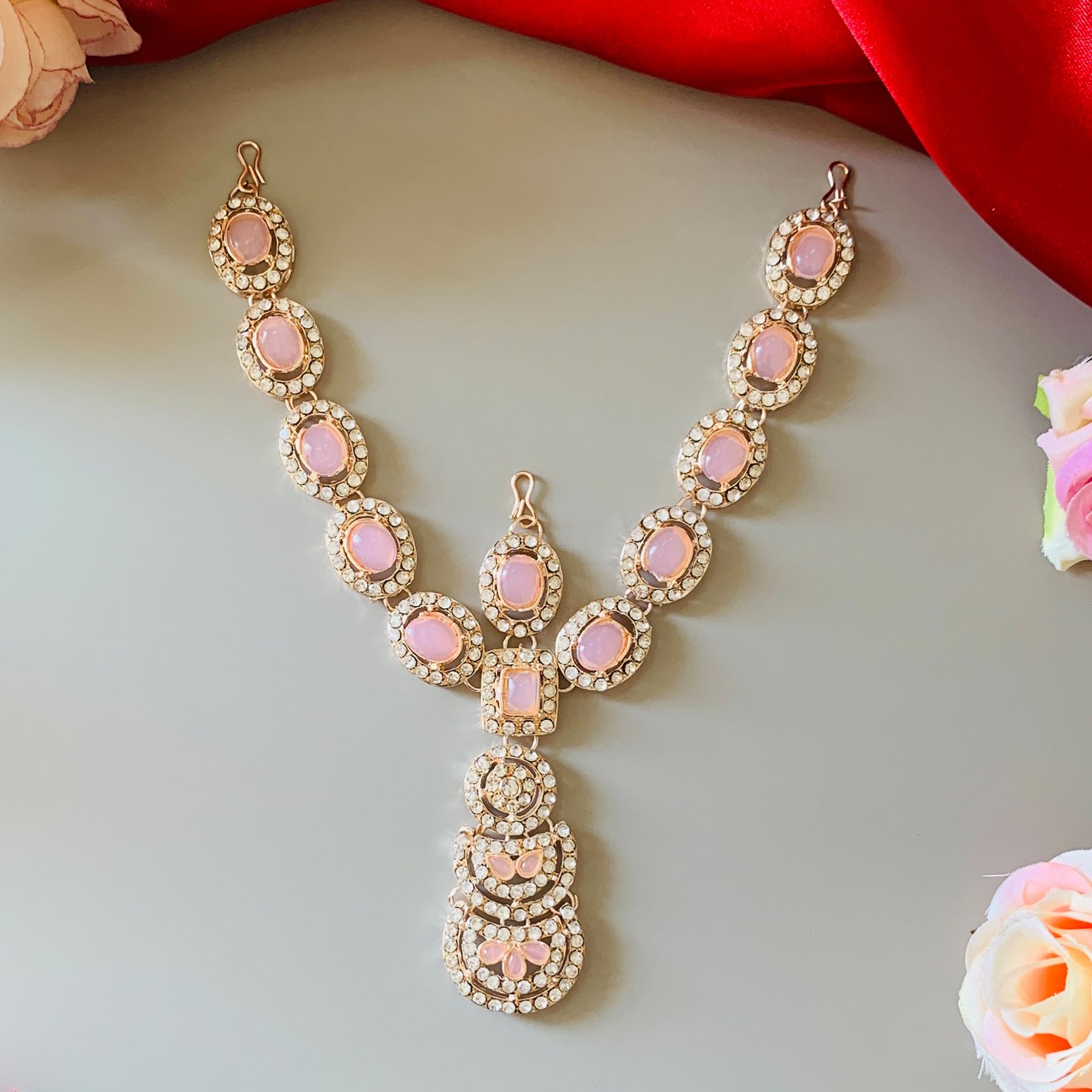 Gold Plated Pink CZ Necklace Earrings Maang Tikka Set