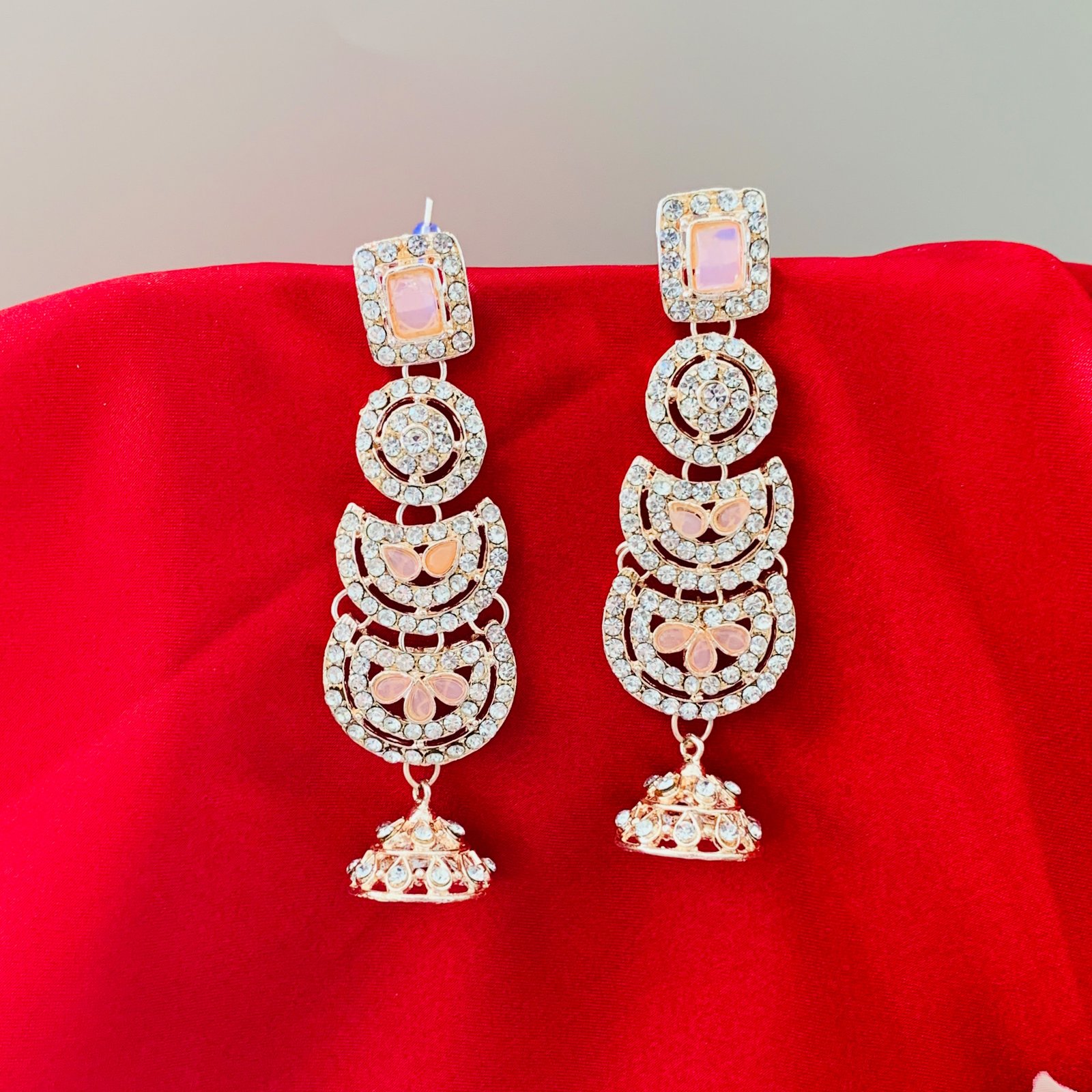 A striking gold-plated jewellery set including a layered statement necklace, matching dangling earrings, and a decorative maang tikka, all set with light pink and white cubic zirconia stones. Ideal for festive parties, receptions, and special events, this coordinated set blends floral and fan motifs for an elegant, photo-ready finish.