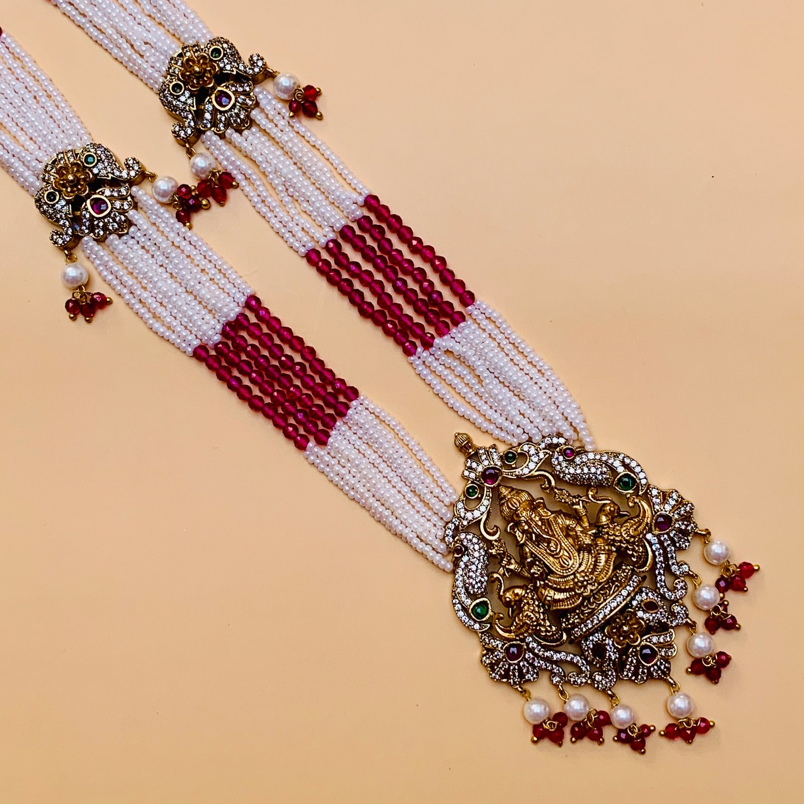 This temple-style imitation necklace set from Toshaka Jewellers brings divine elegance to traditional jewellery styling. The necklace features multiple strands of pink and white artificial moti beads, anchored by a large Lord Ganesh pendant adorned with American diamond style accents and soft pink stones. Hanging bead clusters add movement and ceremonial richness, while side motifs echo the central design for balanced composition.