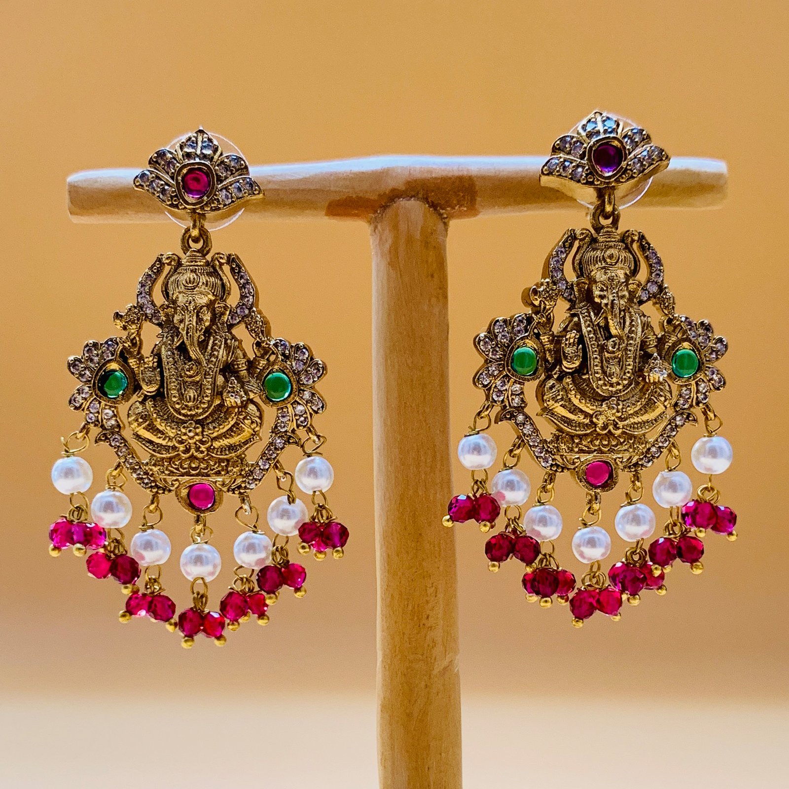 The matching earrings mirror the deity motif with intricate craftsmanship, pink and white stones, and coordinated beadwork for a cohesive, ornate finish. Crafted on a sturdy brass base with gold plating, the set offers substantial presence and cultural resonance without the weight or care demands of fine jewellery. Ideal for weddings, religious functions, and festive wear, this set blends spiritual symbolism with regal styling for confident occasion dressing.