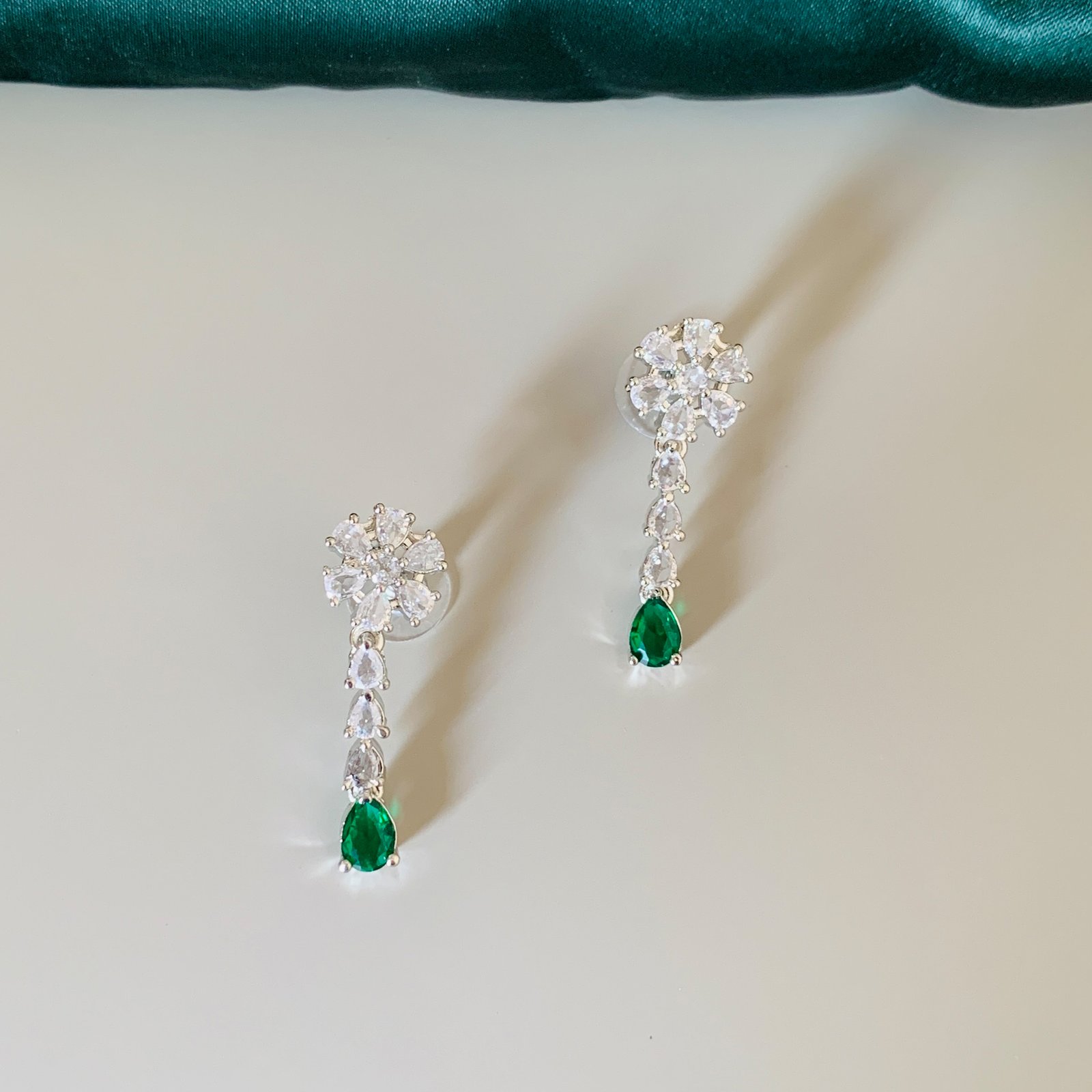 This silver plated imitation necklace and earrings set blends rich green stones with crisp white American diamond style accents in a balanced, symmetrical layout. The necklace features alternating stones leading to a central teardrop-shaped green pendant framed by white stones, adding graceful movement and visual focus. The matching earrings mirror the design with a vertical composition ending in a teardrop green stone for cohesive styling.