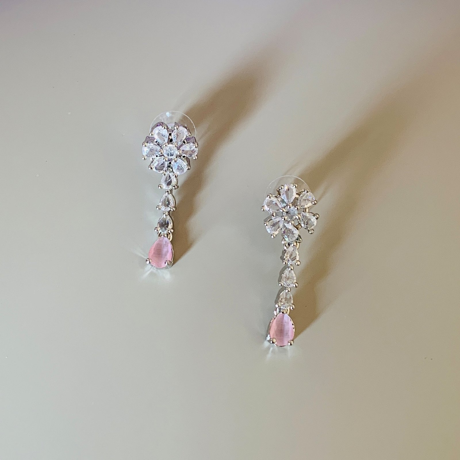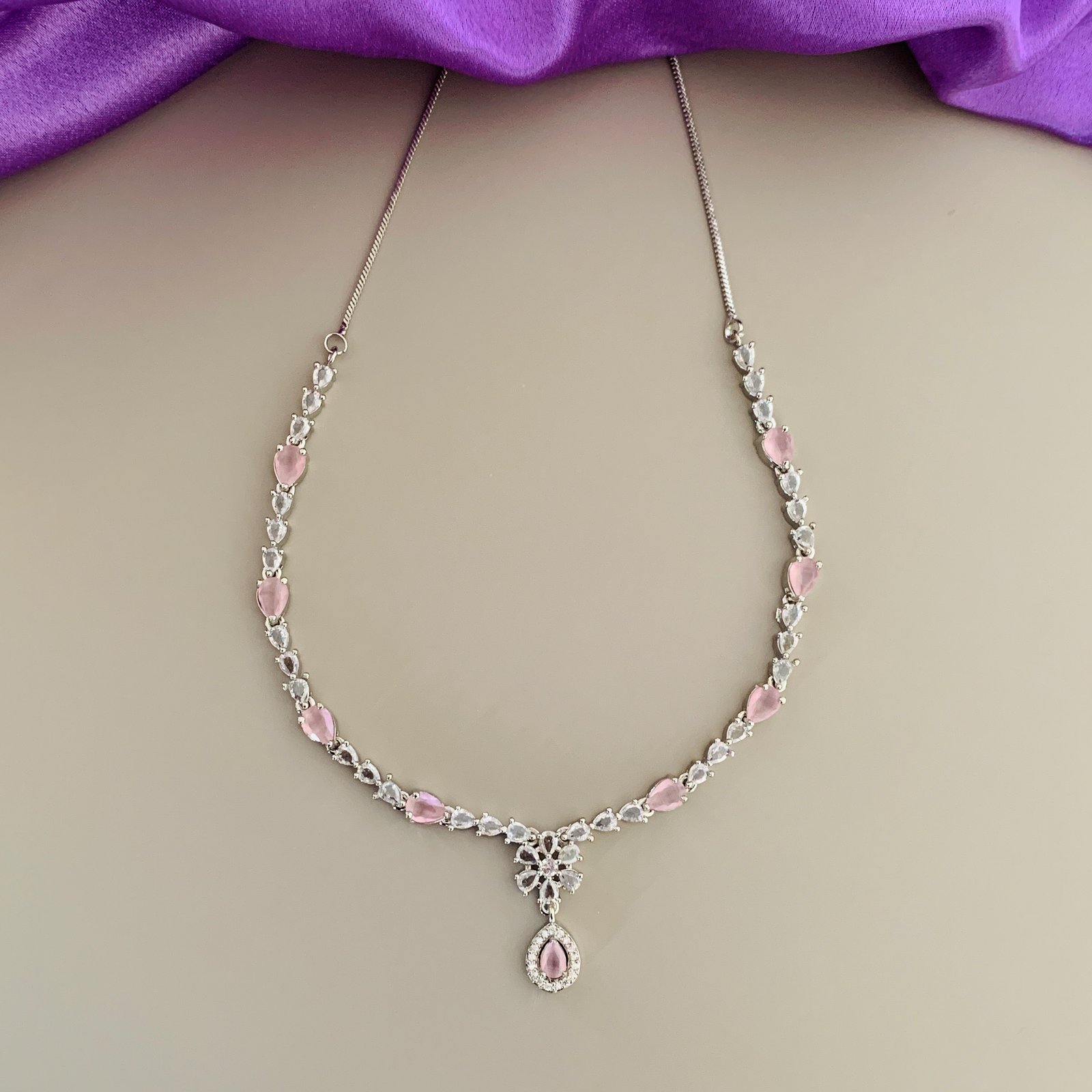This silver plated imitation necklace and earrings set blends delicate light pink stones with crisp white American diamond style accents in a graceful, symmetrical layout. The necklace features alternating pink and white stones leading to a central teardrop-shaped pendant surrounded by clear stones, adding gentle movement and visual focus. The matching earrings mirror the design with a floral top and a dangling pink teardrop element for cohesive styling.