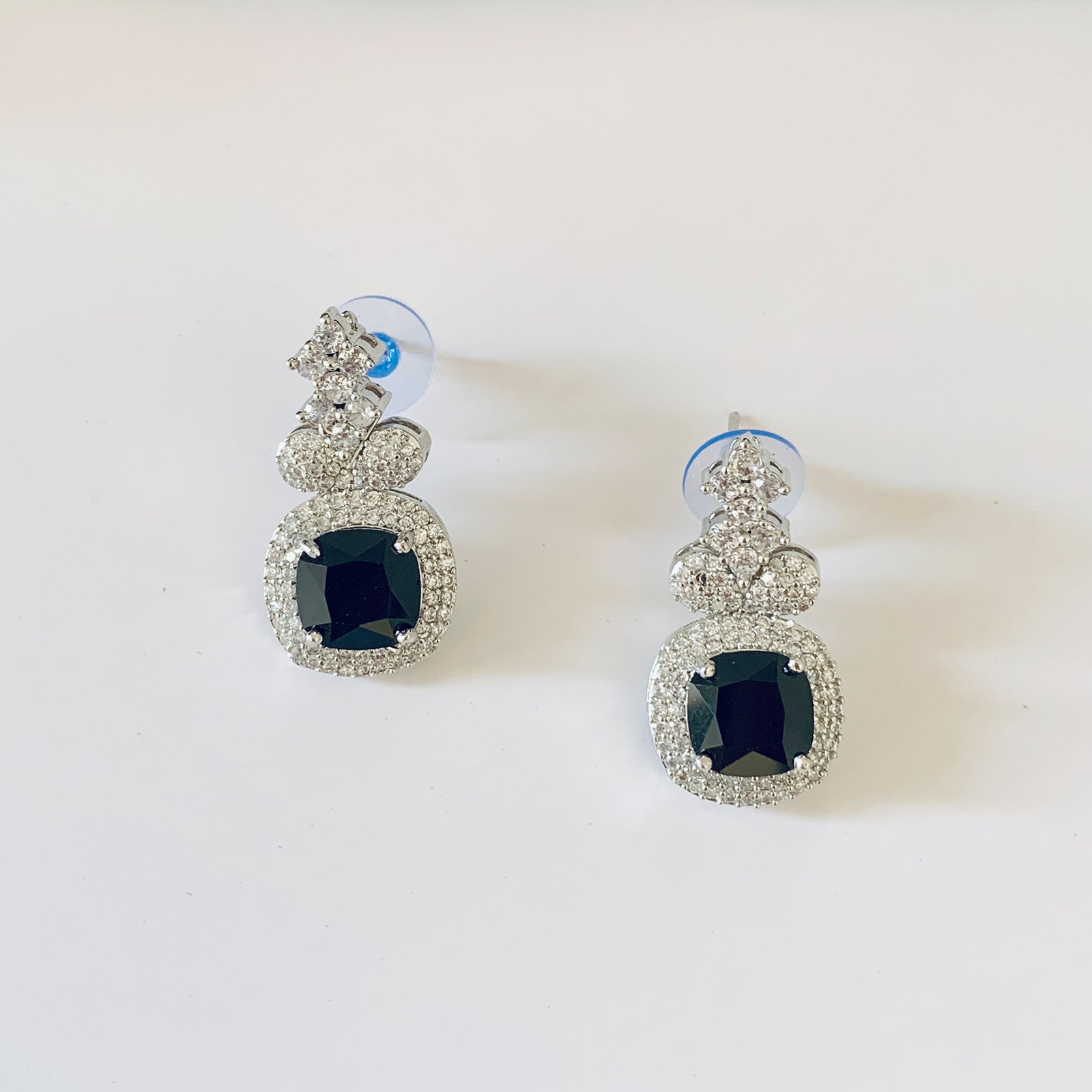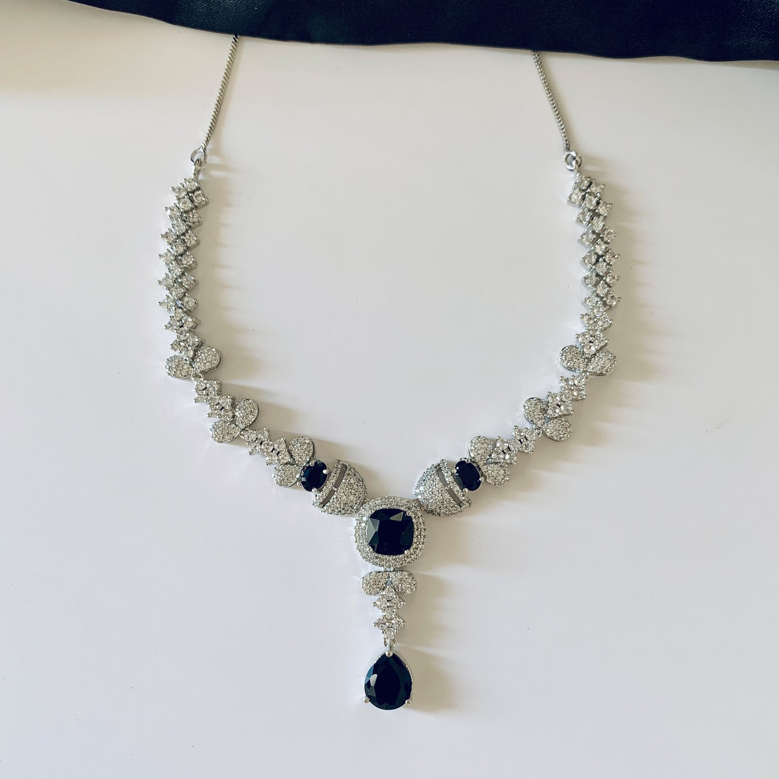 Elegant contrast and refined sparkle define this silver plated imitation necklace and earrings set. The necklace centers on a prominent teardrop black stone surrounded by high clarity white American diamond style accents and a graduated arrangement of clear stones that catch light evenly across the neckline. The matching earrings repeat the same language with a large rectangular black stone encircled by clear accents to create a cohesive, dramatic silhouette.