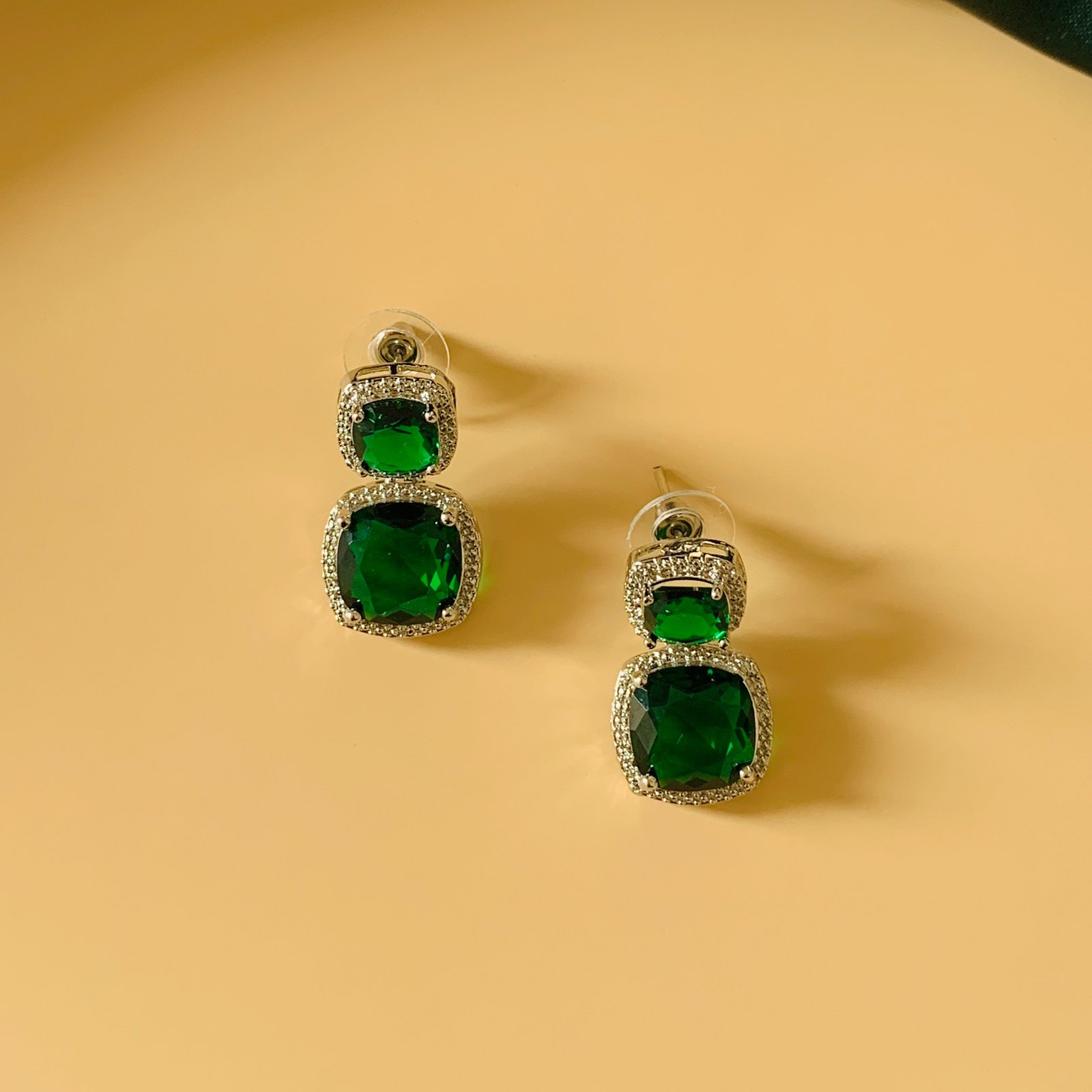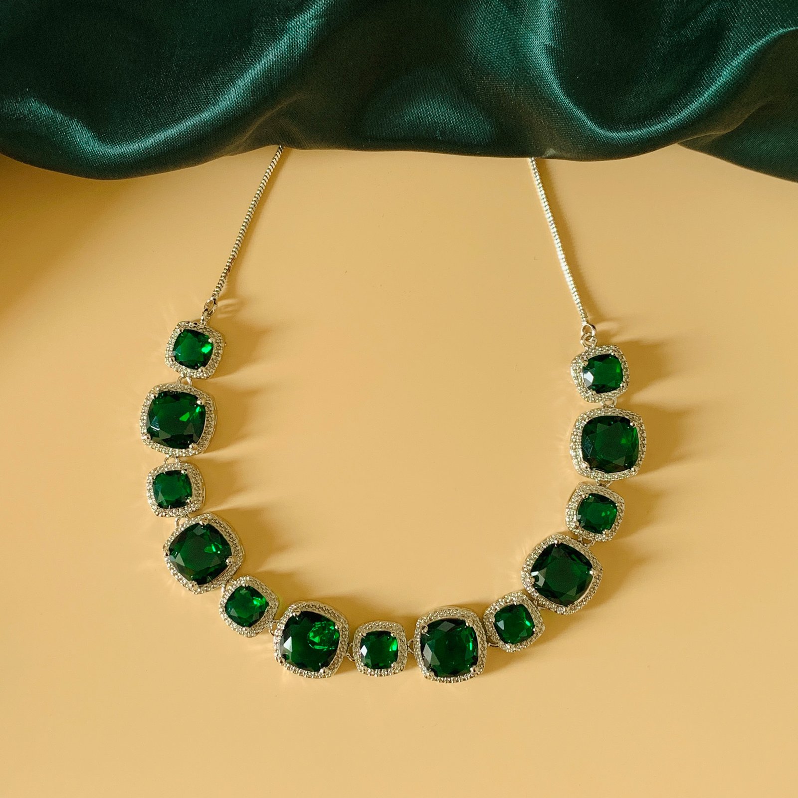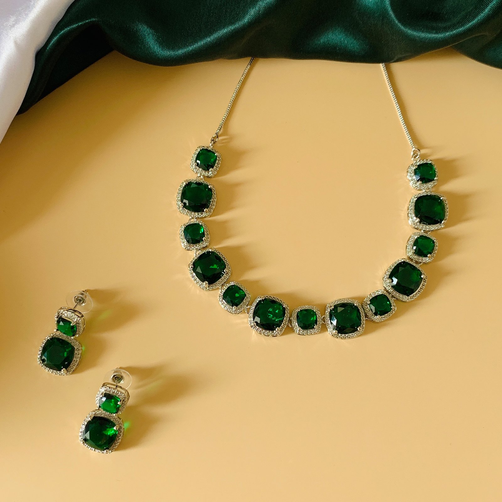 A silver plated imitation jewellery set featuring rich emerald green stones framed by clear American diamond style accents. The coordinated necklace and matching earrings offer bold colour contrast and refined sparkle for festive and formal occasions.