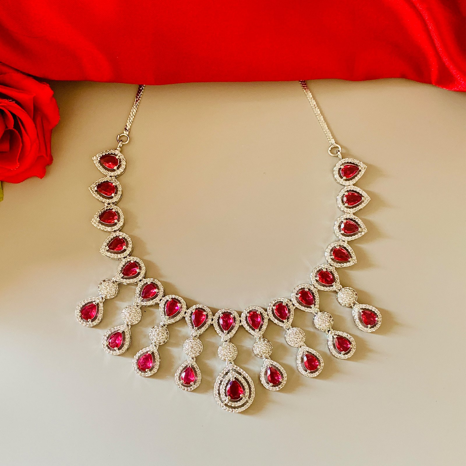 This silver plated imitation necklace and earring set from Toshaka Jewellers combines classic symmetry with soft pink accents for a refined occasion look. Teardrop pink stones are framed by clear American diamond halos to create a cascading silhouette that flatters the neckline and catches light beautifully. The matching earrings repeat the teardrop motif for cohesive movement and balanced proportion.