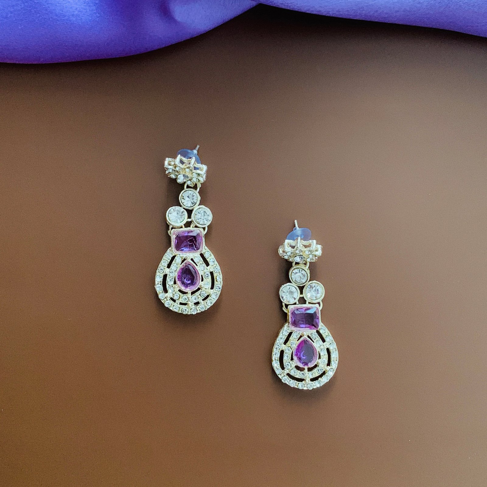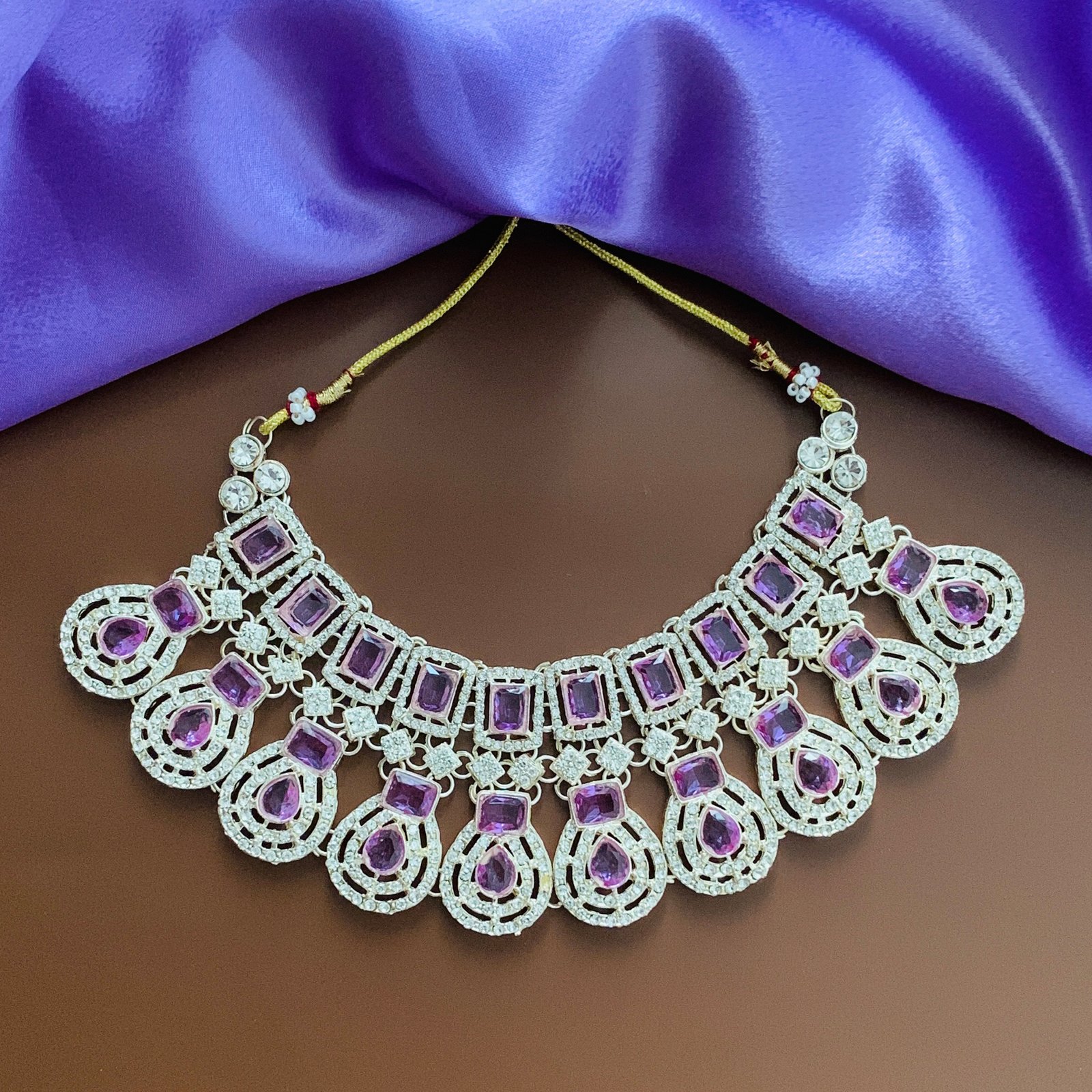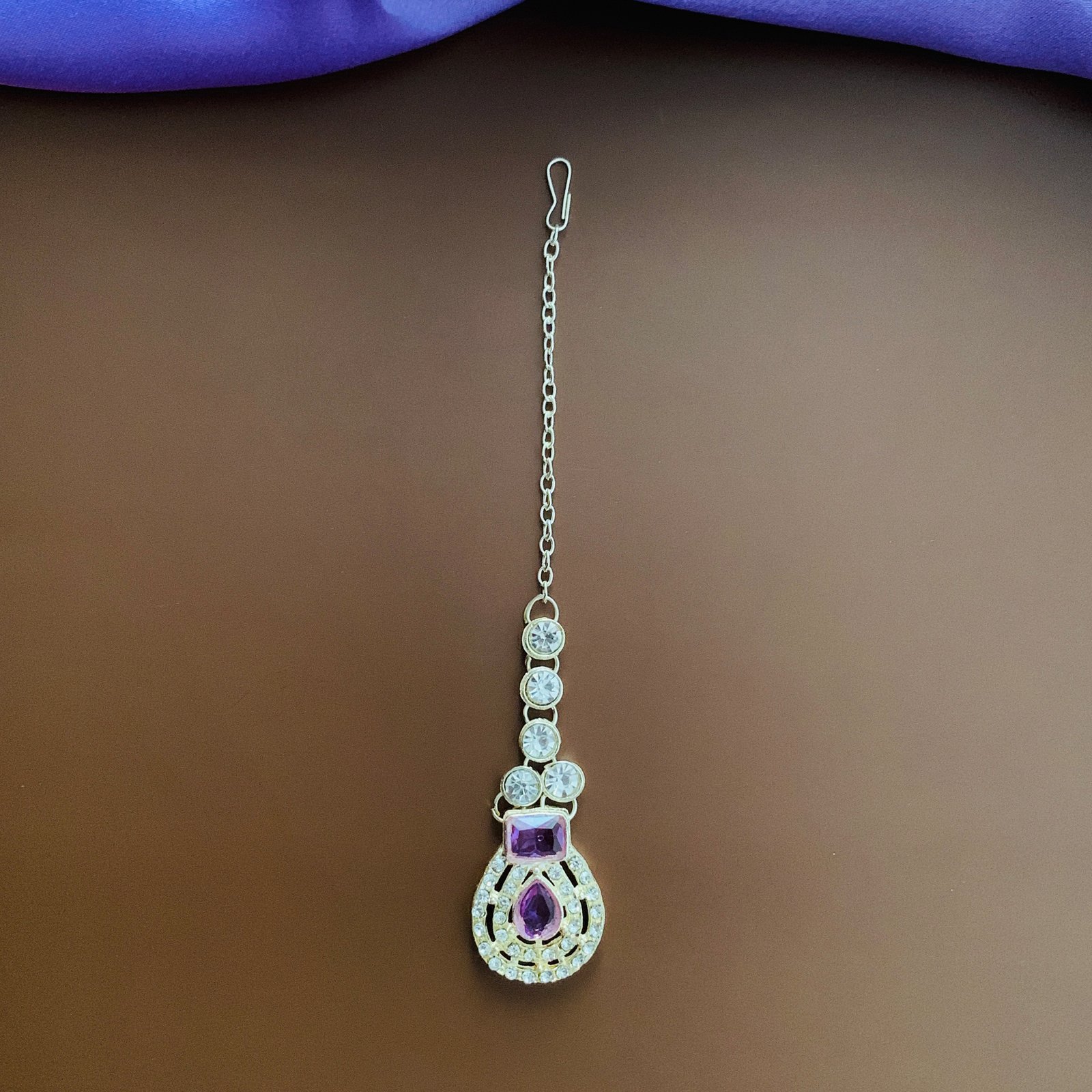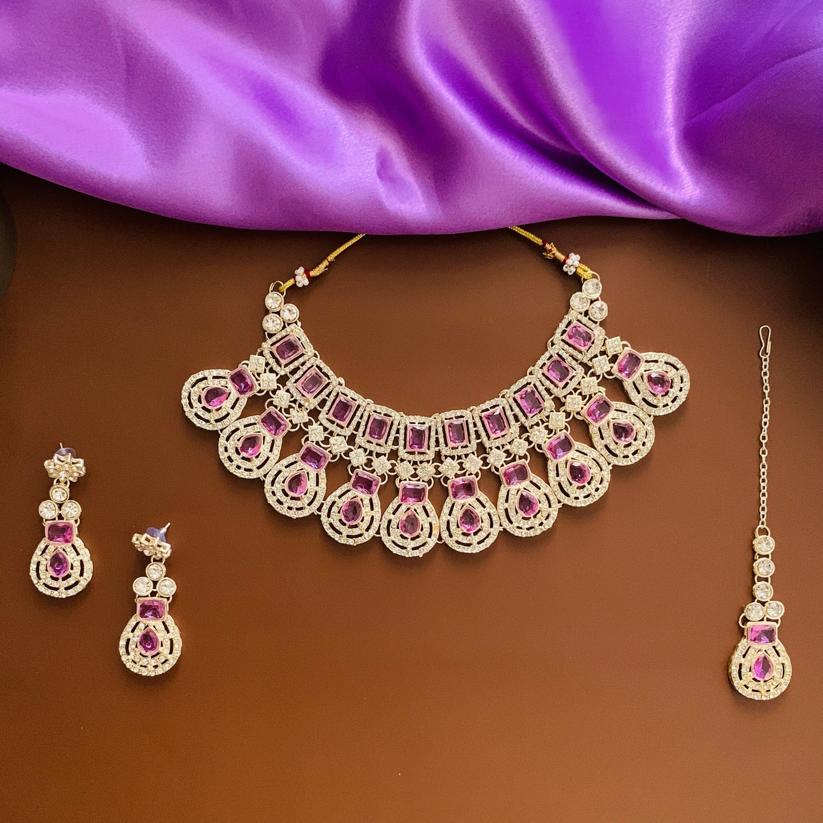 Make an elegant statement with this silver-plated imitation jewellery set from Toshaka Jewellers. The set includes a bold necklace, a pair of matching drop earrings, and a coordinating maang tikka, each richly adorned with deep purple cubic zirconia bordered by luminous white stones for striking contrast. Designed with curved, segmented arrangements and teardrop accents, every piece mirrors the same refined pattern to create a cohesive, photo-ready ensemble that catches light beautifully.