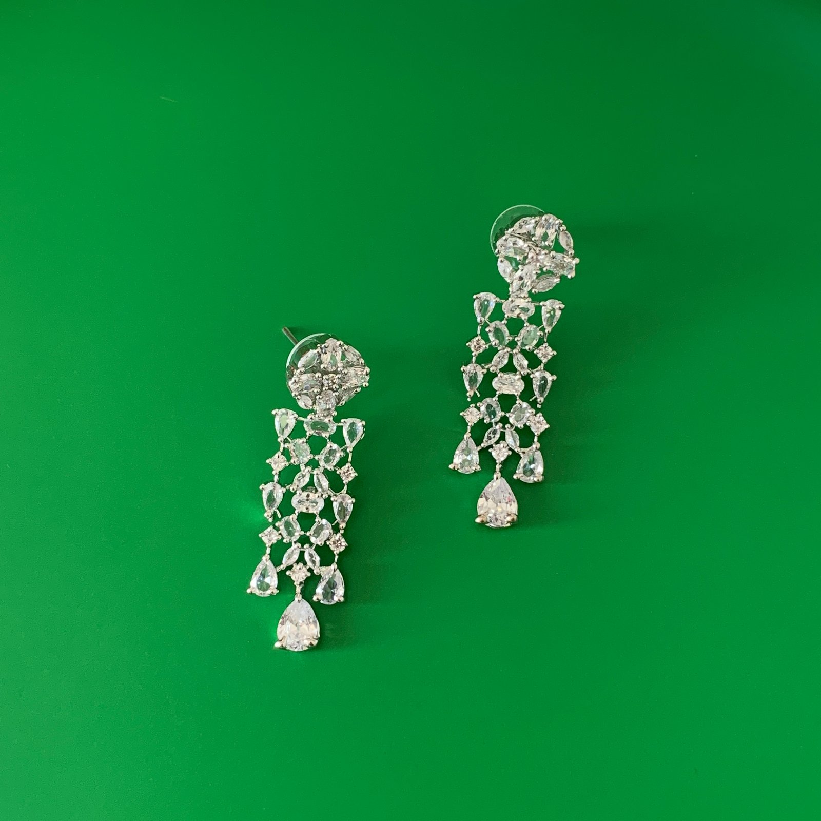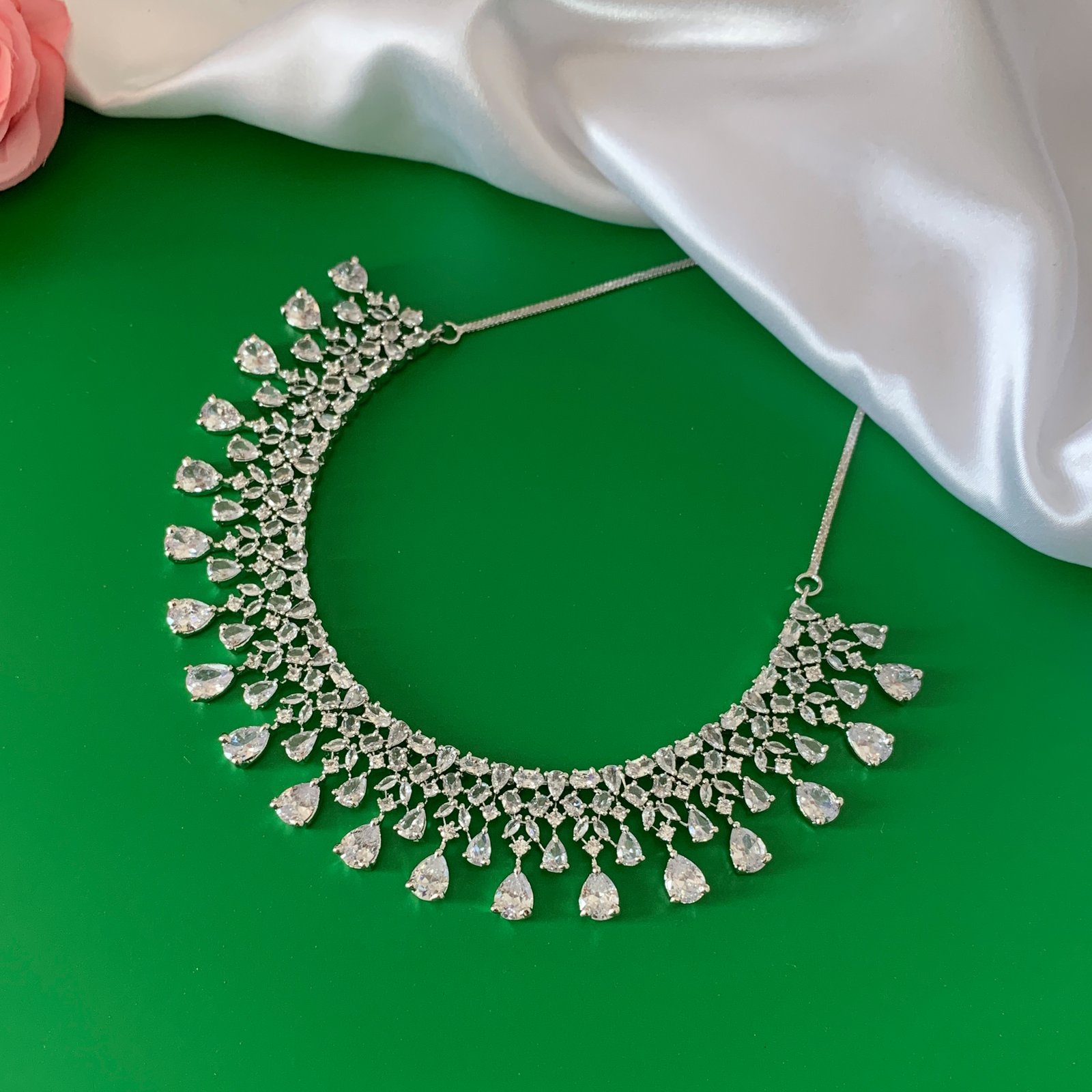 Finished over a durable brass base with polished silver plating, the set offers the visual clarity of fine jewellery with the convenience of imitation pieces. Wear it with evening gowns, sarees, or contemporary indo western outfits for a look that reads timeless and photographed well. Thoughtfully composed and clearly marked as imitation jewellery, this set makes a versatile choice for moments when refined sparkle and easy styling matter most.