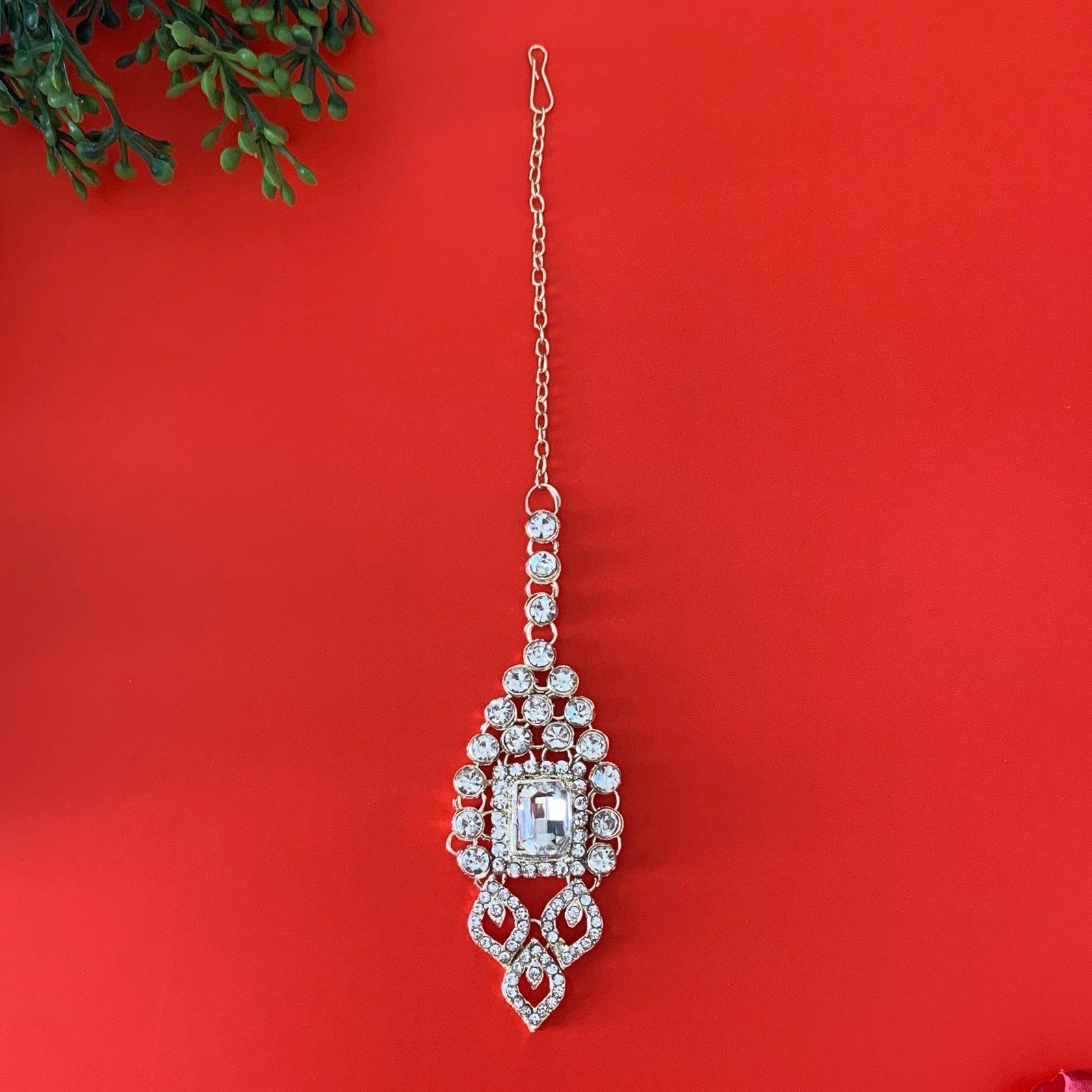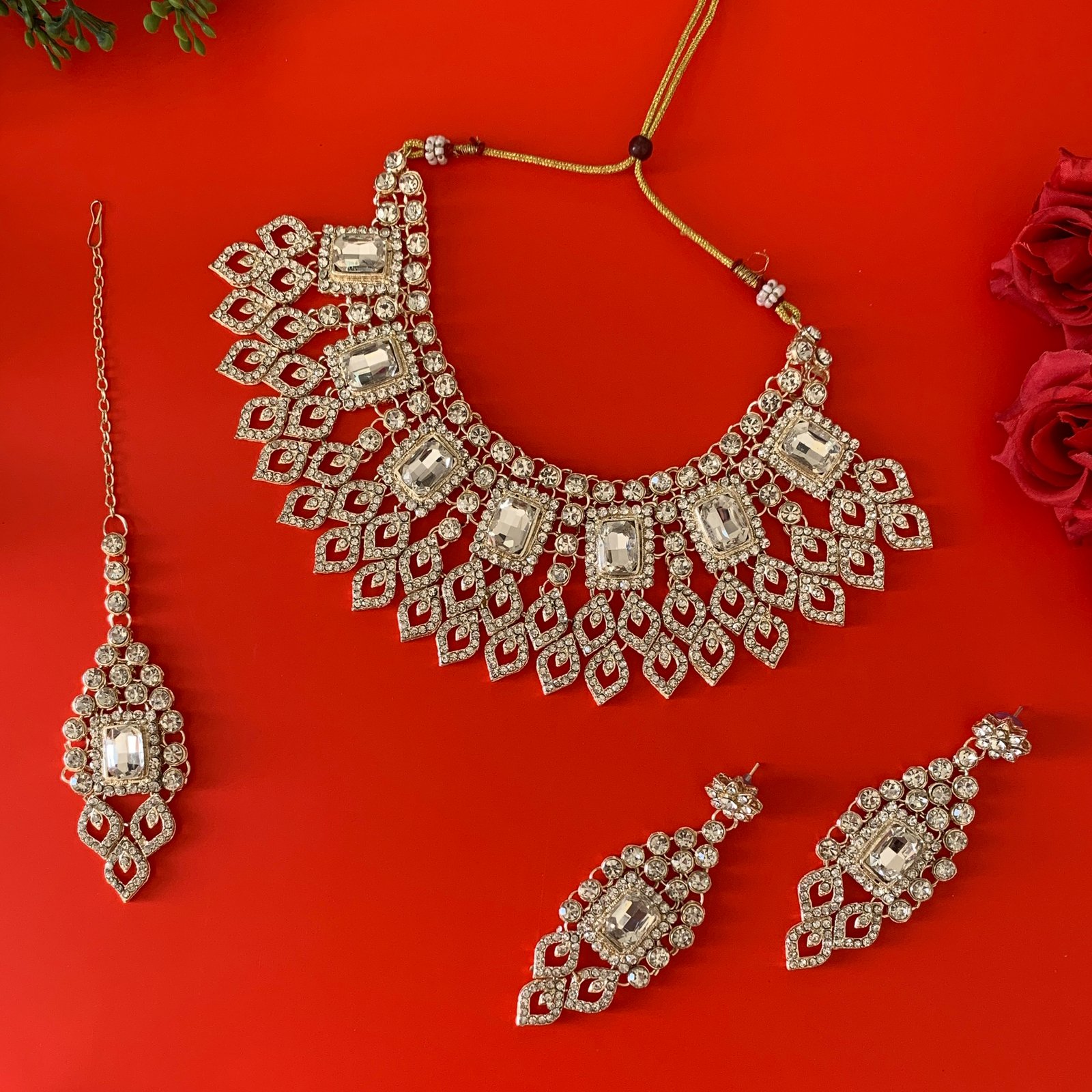 Silver Plated White CZ Necklace Earrings Maang Tikka Set
