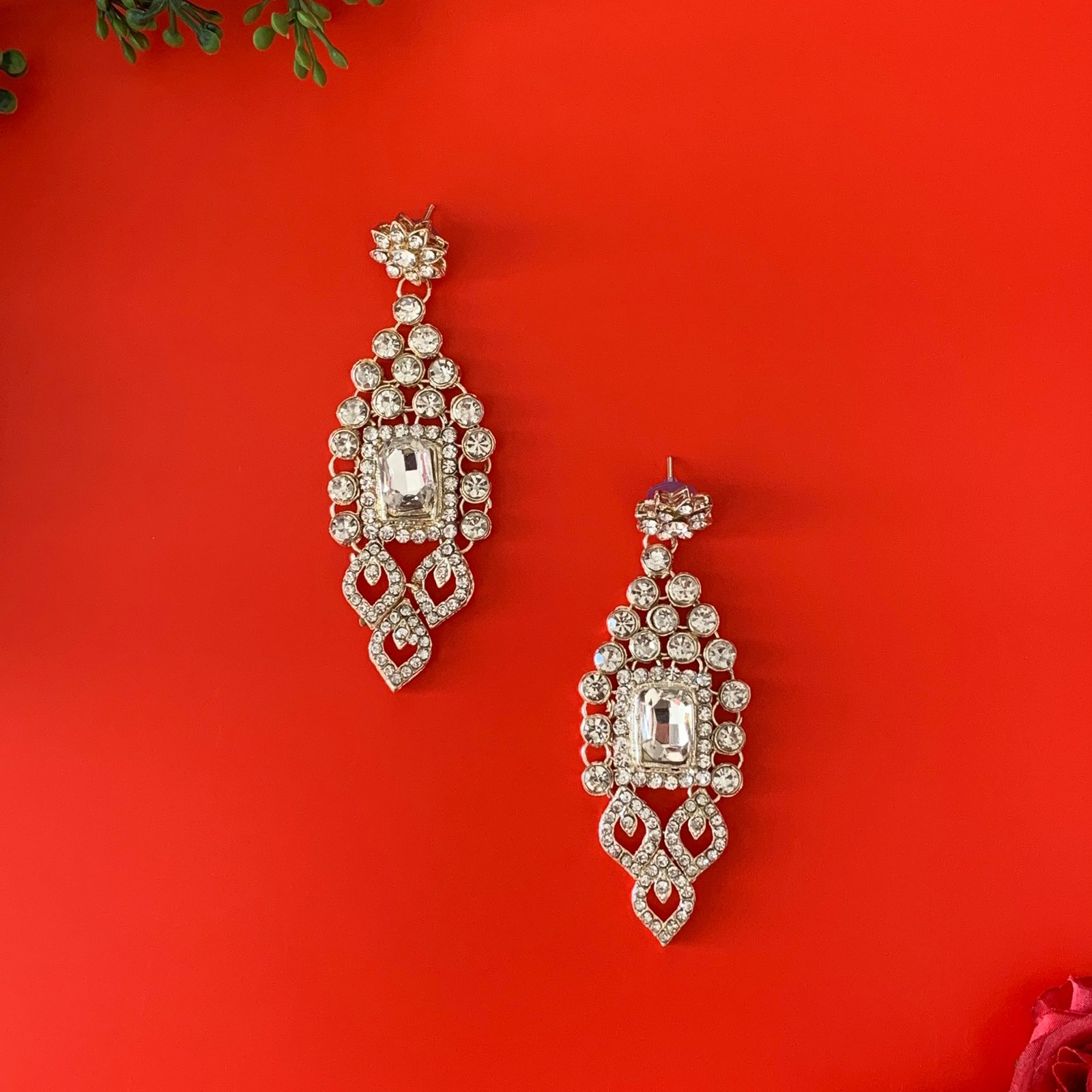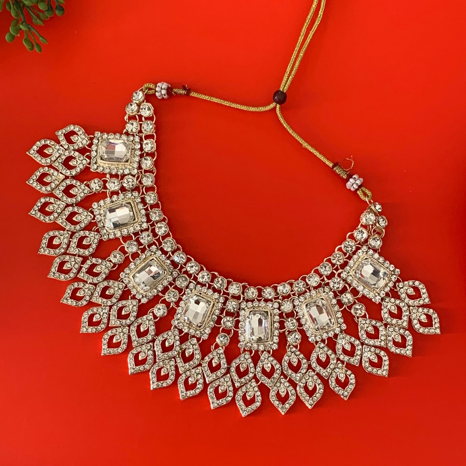 A radiant silver-plated imitation jewellery set including a bold multi-layer necklace, matching drop earrings, and a decorative maang tikka, all set with sparkling white cubic zirconia stones. Ideal for festive occasions, parties, and evening events, this coordinated set combines geometric and floral motifs with dangling teardrop accents for an elegant, photo-ready finish that complements sarees, gowns, and Indo-western outfits.